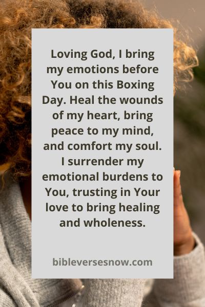 Loving God, I bring my emotions before You on this Boxing Day. Heal the wounds of my heart, bring peace to my mind, and comfort my soul. I surrender my emotional burdens to You, trusting in Your love to bring healing and wholeness.